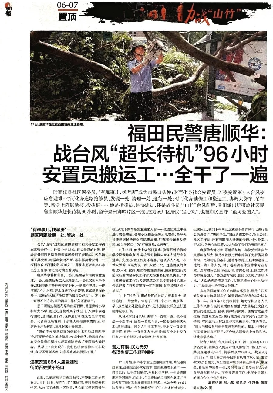 ★★深圳遭遇三十年來最強臺風“山竹”襲擊,景田派出所民警唐順華堅守景田獅嶺片區(qū),頂風冒雨搶險救災,處理倒伏樹木、清理路障,連續(xù)90多個小時沒有回家。