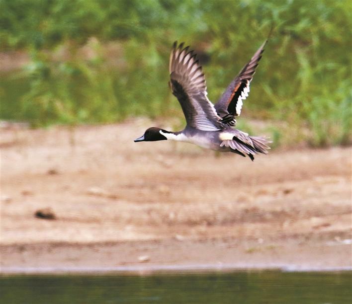 一只針尾鴨飛過3號(hào)魚塘上空。