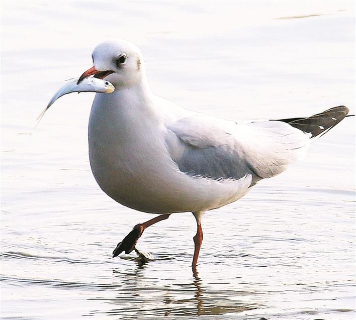 再往東去,便是深圳河入海口,這里也是深圳河與新洲河的交匯處。在這里,除了5只黑臉琵鷺正在河口覓食,河面上還聚集著上千只紅嘴鷗。每當(dāng)疏浚河道的船只駛過,紅嘴鷗就成群結(jié)隊(duì)地尾隨著船只的航跡,捕食被船槳翻到水面上的魚蝦。