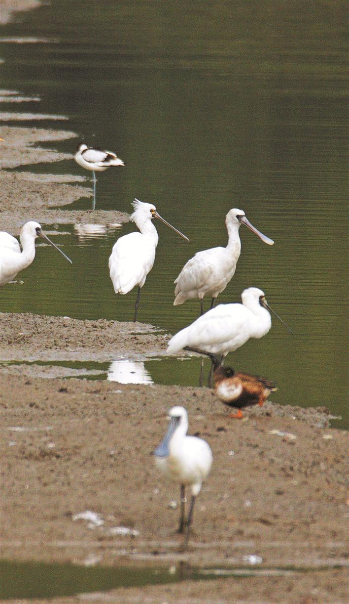 中午12時(shí)許,福田紅樹林國(guó)家級(jí)保護(hù)區(qū)的2號(hào)魚塘里,已經(jīng)聚集了45只珍稀候鳥——黑臉琵鷺。在它們身邊,還有數(shù)百只反嘴鷸、針尾鴨、綠翅鴨、琵嘴鴨、赤頸鴨、青腳鷸等候鳥在水中忙著覓食。