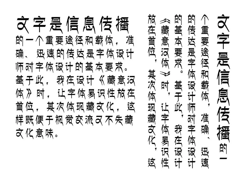 為了設(shè)計出具有藏文的漢字字體,他不僅自己鉆研,還屢次向西藏當(dāng)?shù)鼐庉嫴匚淖值涞木庉嬋〗?jīng)。后經(jīng)過一稿、二稿、三稿,反復(fù)的設(shè)計創(chuàng)作,終于有了《方正藏意漢體》,且作品第一次參賽就獲得大獎,受到業(yè)內(nèi)好評。