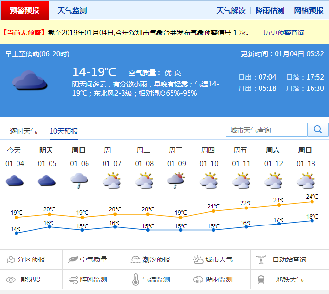 深圳市氣象局預計,今日氣溫14-18℃;5日下午到9日受弱冷空氣影響,氣溫小幅波動,早晚有輕霧,間中有小雨,部分時間可見陽光。