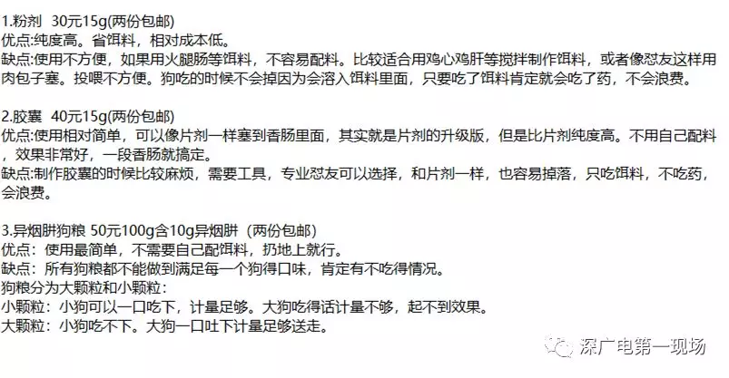 今天上午,記者通過搜索,找到了一名專門售賣異煙肼的網(wǎng)友,對(duì)方給出了粉劑、膠囊、異煙肼狗糧三種套餐,每種套餐中還特地標(biāo)明了針對(duì)寵物狗的配料優(yōu)缺點(diǎn),并且直接將寵物狗吃下后的效果也標(biāo)明在其中。