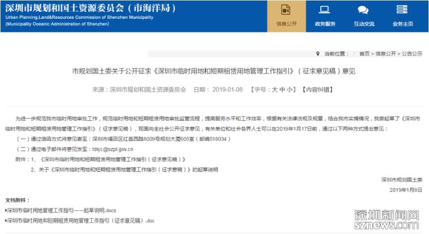 深圳新聞網(wǎng)2019年1月8日訊(記者 潘潤華)1月8日,市規(guī)土委起草發(fā)布《深圳市臨時(shí)用地和短期租賃用地管理工作指引(征求意見稿)》(以下簡稱“征求意見”)。根據(jù)該征求意見,社會(huì)投資主體組織實(shí)施的急需公共服務(wù)設(shè)施用地為短期租賃用地,需按照我市地價(jià)測(cè)算相關(guān)規(guī)則繳交租金。
