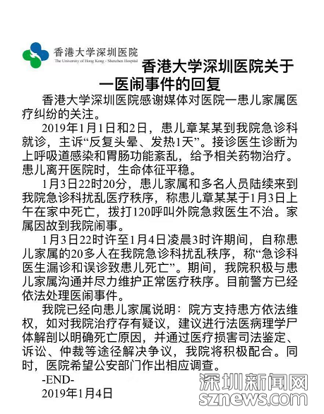 對此,港大深圳醫(yī)院回應:患兒離院時生命體征平穩(wěn),支持患方依法維權