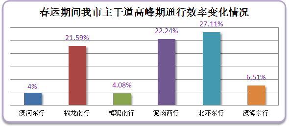 經(jīng)對(duì)我市城區(qū)主干道高峰期車流量監(jiān)測,預(yù)計(jì)春運(yùn)期間我市早晚高峰道路日趨順暢,全市各條主干道及進(jìn)出關(guān)道路平均通行效率提高一成,北環(huán)東行、泥崗路西行行車效率提升最為明顯。