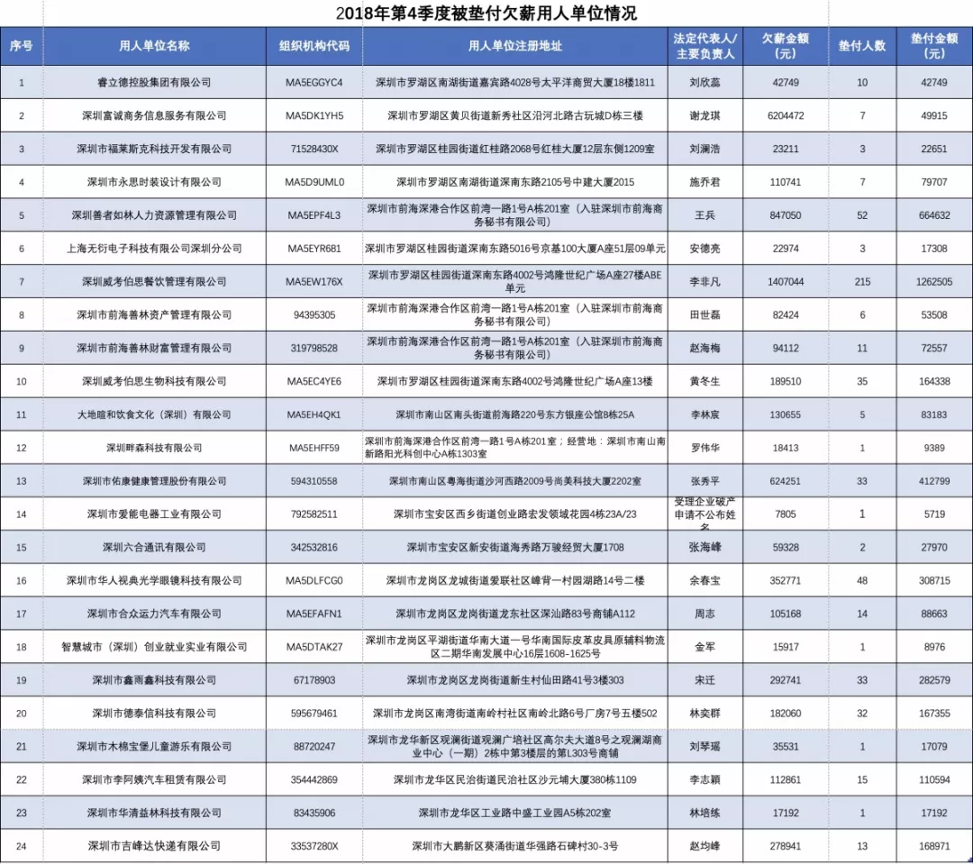 根據(jù)《深圳經(jīng)濟(jì)特區(qū)欠薪保障條例》第二十二條規(guī)定,深圳市人力資源保障局公布2018年第四季度拖欠員工工資并由各區(qū)人力資源部門啟動(dòng)市欠薪保障基金墊付員工工資的用人單位情況。