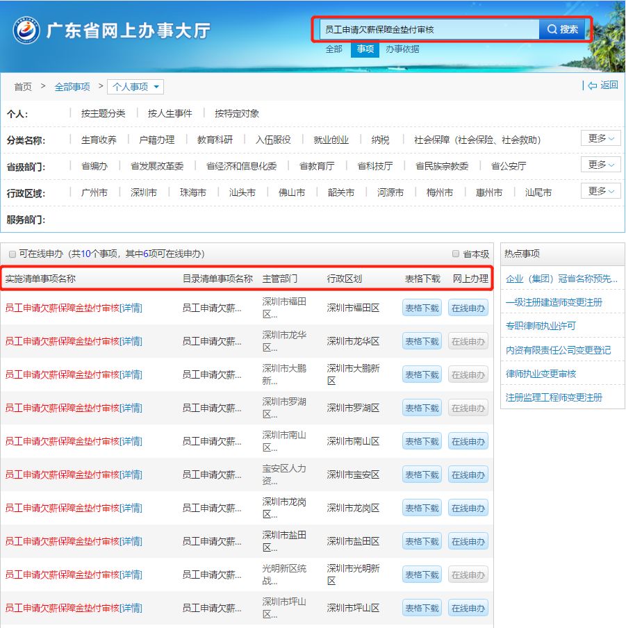 答:員工登錄廣東省網(wǎng)上辦事大廳官網(wǎng),點(diǎn)擊“個(gè)人事項(xiàng)”,在搜索欄中輸入“員工申請(qǐng)欠薪保障金墊付審核”,可查詢(xún)到各區(qū)“員工申請(qǐng)欠薪保障金墊付審核”事項(xiàng),選擇所在區(qū)點(diǎn)擊“詳情”,即可查詢(xún)到所在區(qū)人力資源部門(mén)的咨詢(xún)電話(huà)、辦理地址、辦理時(shí)間和交通指引等相關(guān)信息。