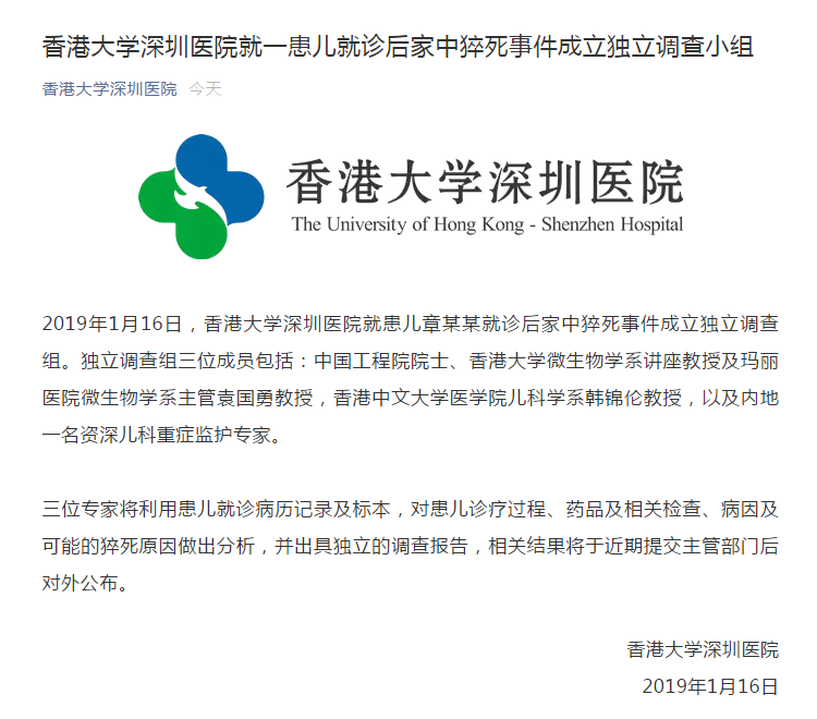 1月16日,香港大學深圳醫(yī)院就患兒章某某就診后家中猝死事件成立獨立調(diào)查組,待調(diào)查完畢后將把相關結果提交主管部門并對外公布。