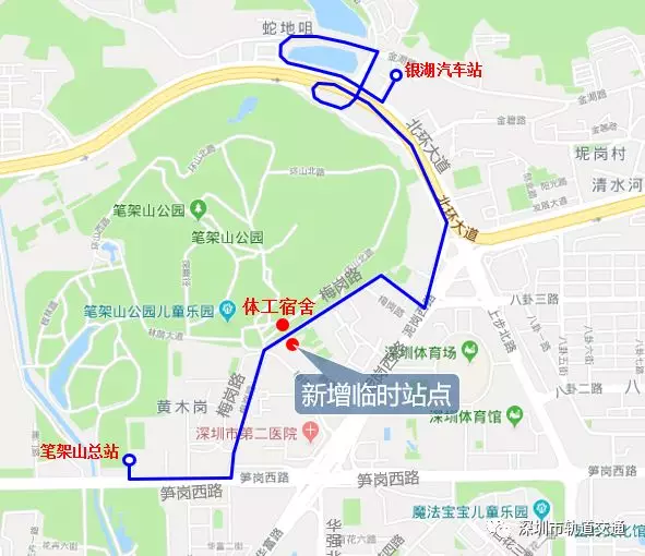 (1)新增筆架山總站-銀湖汽車總站聯(lián)系線路,線路雙向途經(jīng)筍崗路、梅崗路、泥崗西路、北環(huán)大道。??裤y湖汽車站(銀湖地鐵站)、體工宿舍、市二醫(yī)院①(黃木崗地鐵站)、筆架山總站。(詳見圖5)