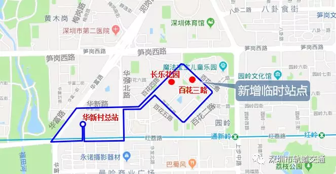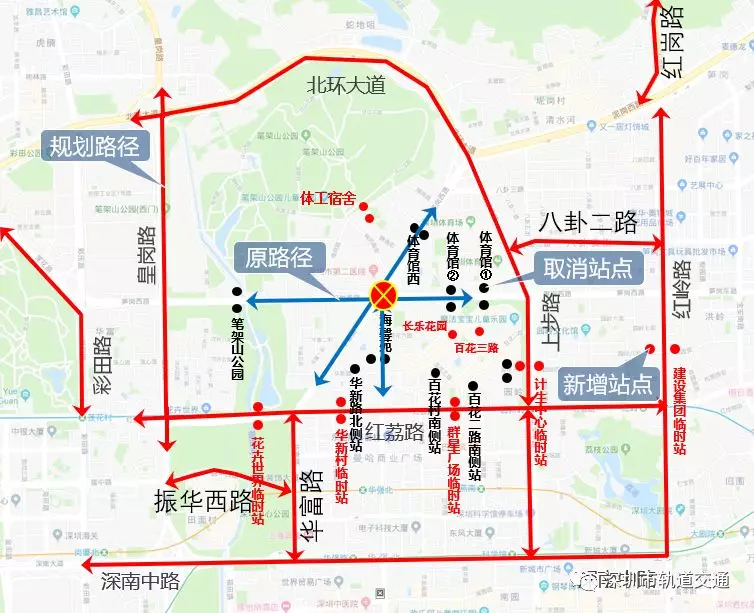 (2)原經(jīng)筍崗西路西行-華富路、泥崗西路南行-華富路-華新路到達的交通調(diào)整為:上步路-紅荔路-華強北路-華新路/上步路-筍崗西路-百花四路-華新路。