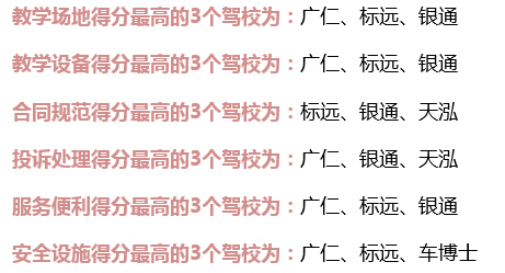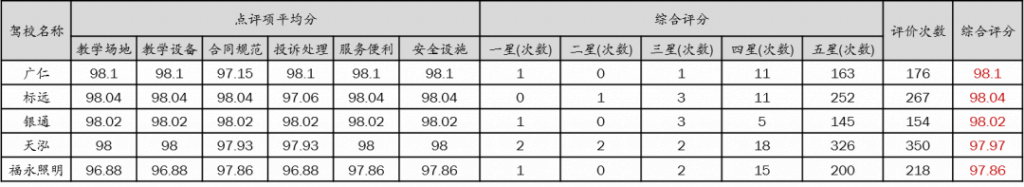 學(xué)員對(duì)駕校打分平均分為95.74分(滿分100分),與第三季度95.71分基本持平。其中,綜合評(píng)分最高的前5名駕校分別為:廣仁、標(biāo)遠(yuǎn)、銀通、天泓、福永照明。