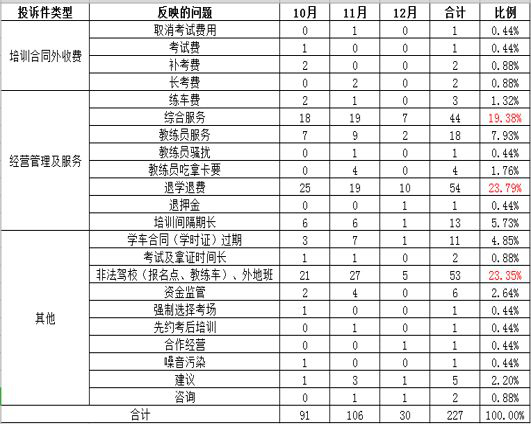 第四季度投訴主要集中在退學(xué)退費(fèi)、非法駕校(報(bào)名點(diǎn)、教練車)、外地班等問(wèn)題。學(xué)員與不合規(guī)范的駕校、外地班產(chǎn)生的矛盾是本季度產(chǎn)生投訴的主要原因;此外,還有部分學(xué)員反映綜合服務(wù)等問(wèn)題。