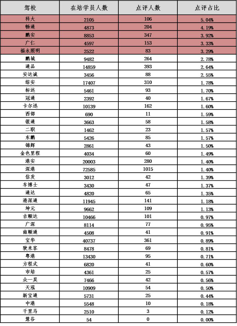 以下對(duì)深圳各駕校詳細(xì)信息進(jìn)行公布,市民可根據(jù)下表,選擇人車比和在培待考量相對(duì)較低、學(xué)車周期較短、投訴率較低、誠(chéng)信評(píng)價(jià)等級(jí)較高的駕校進(jìn)行培訓(xùn):