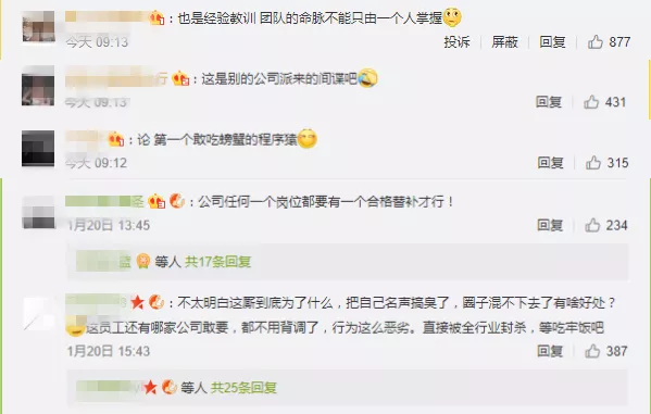 1月20日,深圳市螃蟹網(wǎng)絡(luò)科技有限公司創(chuàng)始人尹柏霖發(fā)文控訴,前員工燕某在游戲上線測試當(dāng)天(2017年12月15日),鎖死服務(wù)器與電腦,并惡意失蹤,致公司損失慘重。尹柏霖稱,“我們上線不了也測試不了,等新員工到職后熟悉新代碼又是幾個月過去了。”