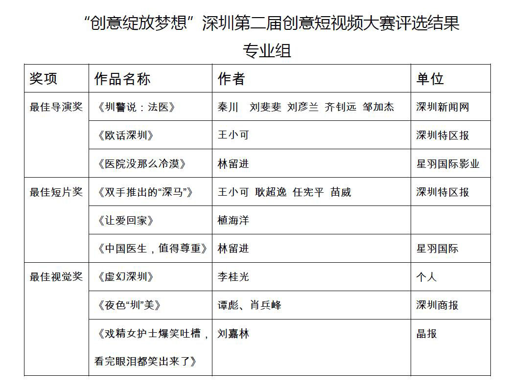 作為創(chuàng)意12月活動的重頭項目,本次視頻大賽由深圳報業(yè)集團、深圳市網(wǎng)絡(luò)媒體協(xié)會主辦,深圳新聞網(wǎng)、深圳市中影南方廣告有限公司、深圳市上御同禧文化傳播有限公司承辦,面向社會共征集到視頻作品500余部。大賽組委會邀請了專業(yè)媒體人士和影視大咖擔任評委,共有70件作品入圍終評會,經(jīng)過組委會辦公室的最終評選,最終確定了獲獎作品。參加比賽的,既有新聞媒體界和廣告公司的專業(yè)人士,也有各行各業(yè)熱愛視頻拍攝制作的“發(fā)燒友”,參賽作品題材廣泛,既有記錄深圳城市風(fēng)貌的視覺大片,也不乏故事性強、拍攝剪輯手法新穎、主題立意深刻的作品。