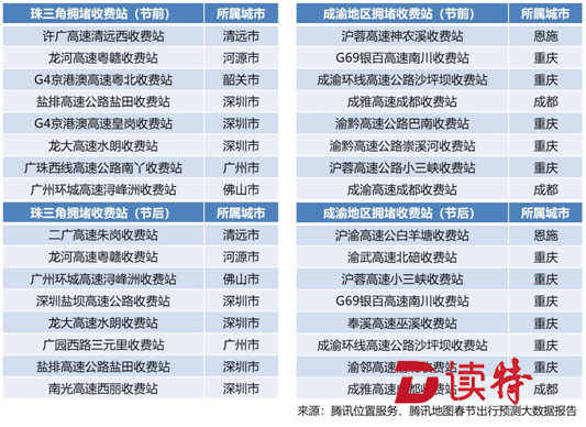 在珠三角地區(qū),擁堵收費(fèi)站全部位于廣東省內(nèi),集中分布在廣州、深圳等中心城市周邊,及通往湖南、江西的省界區(qū)域,擁堵時間與長三角相同。長深高速東江大橋至泰美服務(wù)區(qū)、莞佛高速坦尾立交至虎門大橋,預(yù)計(jì)將成為節(jié)前、節(jié)后最擁堵的高速路段。