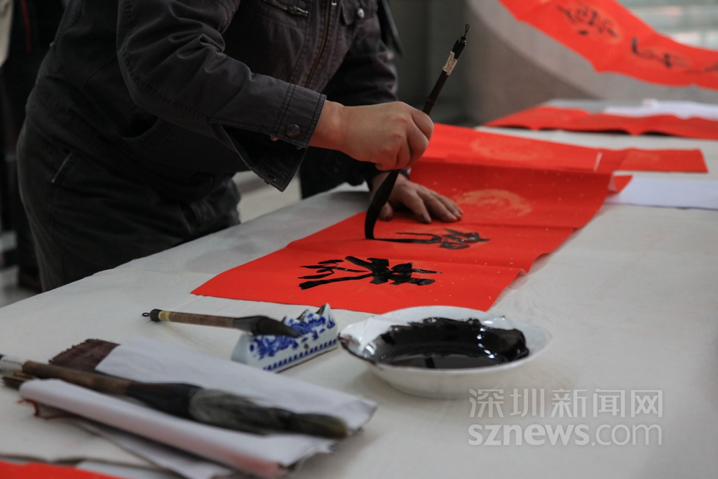 過年貼春聯(lián),是中華民族的傳統(tǒng)習(xí)俗之一??梢哉f,春聯(lián)一出,年味十足。記者在深圳商報(bào)大廈一樓活動(dòng)現(xiàn)場看到,工作人員早已準(zhǔn)備好了春聯(lián)的紅紙和筆墨,多位書法了得的記者編輯揮毫潑墨,創(chuàng)作出了一幅幅寓意喜慶吉祥的對聯(lián),并免費(fèi)贈送給同事。不少人為了能拿到新鮮出爐的春聯(lián),提前在現(xiàn)場排隊(duì)等候。