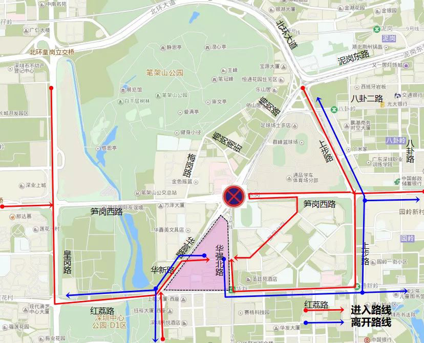 車行交通調(diào)整為:筍崗西路 -梅崗路;紅荔路 -皇崗路 -筍崗西路 -梅崗路;筍崗西路 -泥崗西路 -靜逸街(梅崗南街)。