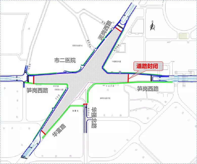 施工期間,對(duì)泥崗西路、華富路、筍崗西路、華強(qiáng)北路黃木崗立交部分路段進(jìn)行封閉,隔斷往來交通。