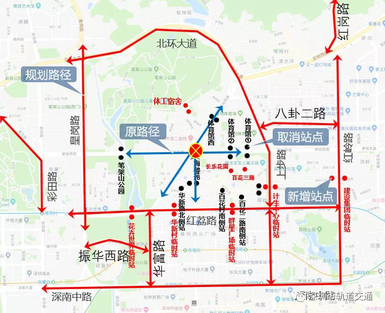 車行交通調(diào)整為:紅荔路 -百花二路;上步路 -筍崗西路 -百花四路上步路 -百花二路上步路 -百花一路。