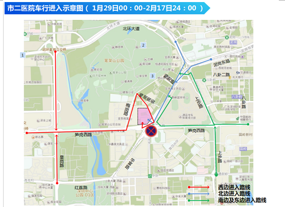 市二醫(yī)院車行進入示意圖--紅色線條為西邊進入醫(yī)院道路,藍色線條為北邊進入醫(yī)院道路,綠色線條為南邊及東邊進入路線。