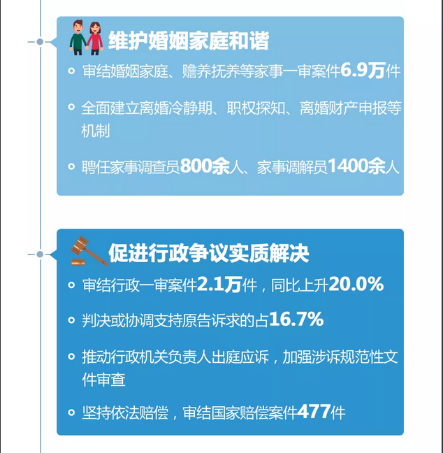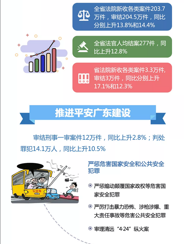 深圳新聞網(wǎng)2019年1月30日訊(記者 張玲 牛耘 發(fā)自廣州)1月30日上午,廣東省十三屆人大二次會議舉行第二次全體會議,人大、兩院報告內容齊亮相。2018年,廣東法院做了哪些工作,交出了一份怎樣的成績單?廣東省高級人民法院院長龔稼立在廣東省高級人民法院工作報告中公布了一組數(shù)據(jù):2018年,全省法院新收各類案件203.7萬件,審結204.5萬件,同比分別上升13.8%和14.4%;法官人均結案277件,同比上升12.8%;案件再審糾錯率1.2‰,案訪比連續(xù)下降。其中,省法院新收各類案件3.3萬件,審結3萬件,同比分別上升17.1%和12.3%。