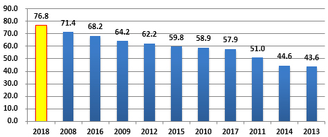 根據(jù)全市區(qū)域自動氣象站臺風(fēng)風(fēng)雨影響綜合年景指數(shù)計算結(jié)果,2018年臺風(fēng)風(fēng)雨影響綜合年景指數(shù)達到76.8,成為2008年以來最嚴重的一年,超過2008年的71.4。