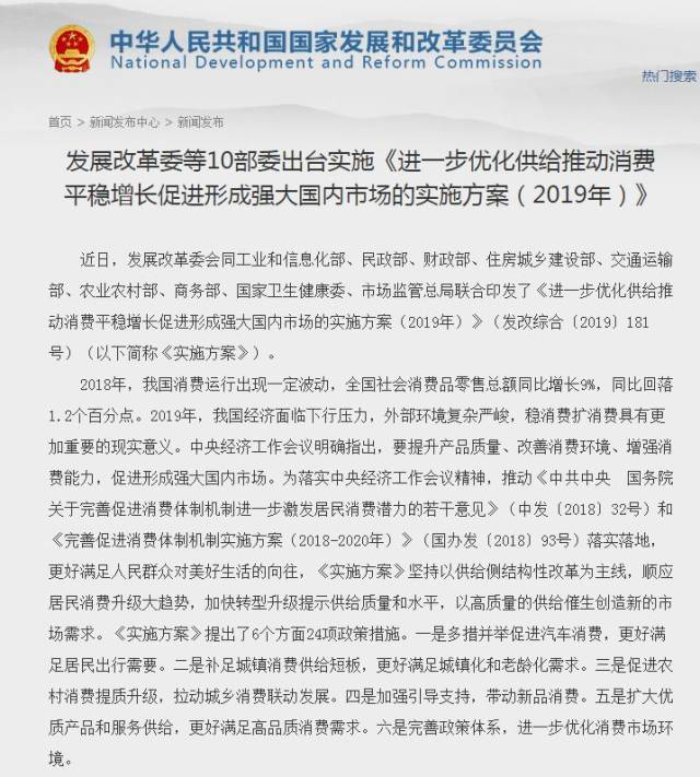 1月29日,“看不過去”的發(fā)改委就印發(fā)了《進(jìn)一步優(yōu)化供給推動消費(fèi)平穩(wěn)增長促進(jìn)形成強(qiáng)大國內(nèi)市場的實(shí)施方案(2019年)》