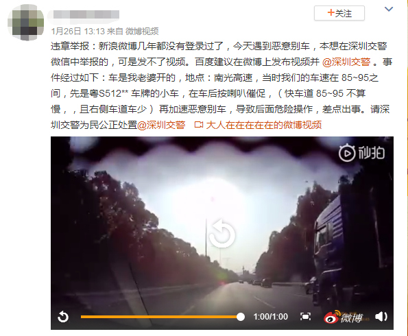 1月26日,有網(wǎng)友在微博爆料稱自己的車在高速上遇到惡意別車,并@深圳交警