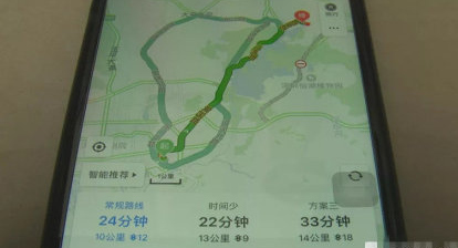 導(dǎo)航路線顯示,乘客所堅(jiān)持的走法是常規(guī)路線,司機(jī)的走法距離更長,但用時較短。