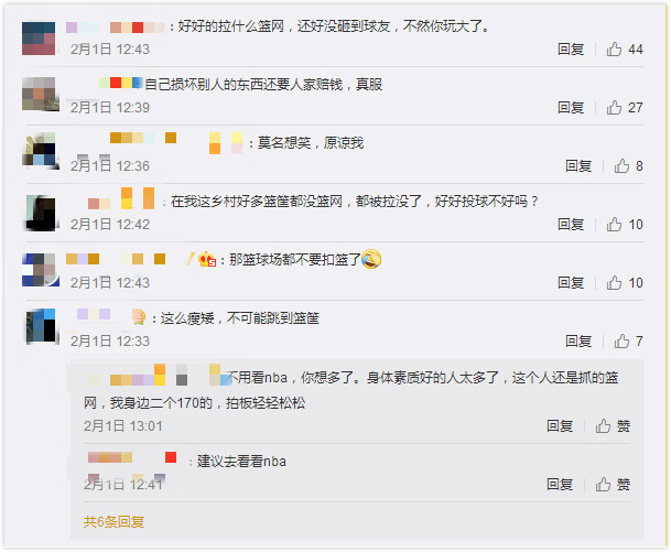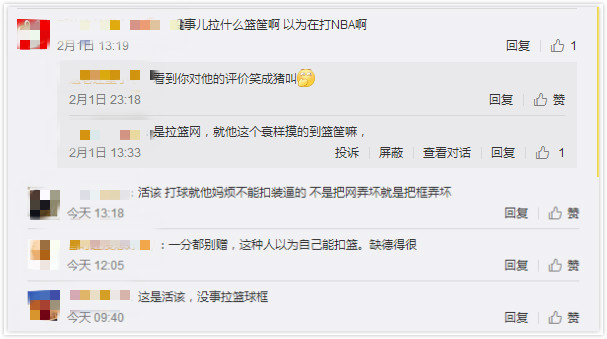 還有一些網(wǎng)友借機(jī)表達(dá)了自己對(duì)某類人的"墻裂"不滿?。]事兒拉什么球框啊,以為在打 NBA啊""活該,打球就煩不能扣還裝 X的"......