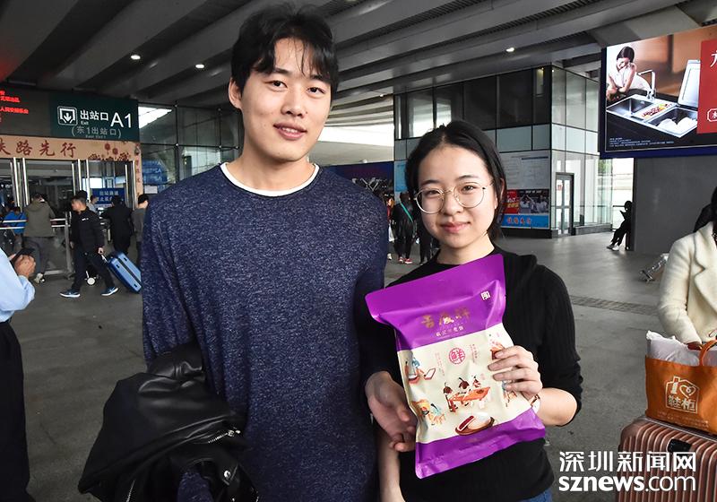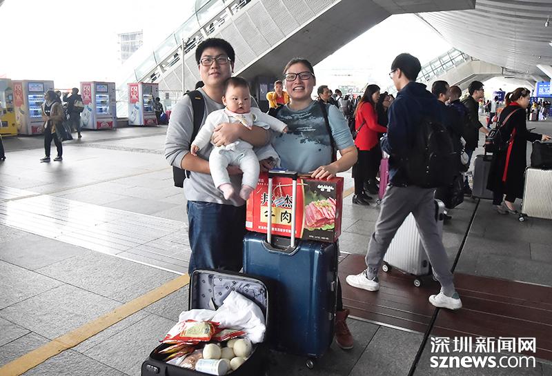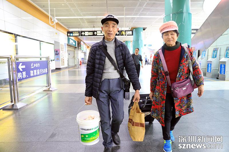 不少旅客攜帶當(dāng)?shù)厮约凹亦l(xiāng)特產(chǎn)返回深圳,圖中這一家人下車(chē)后整理行李