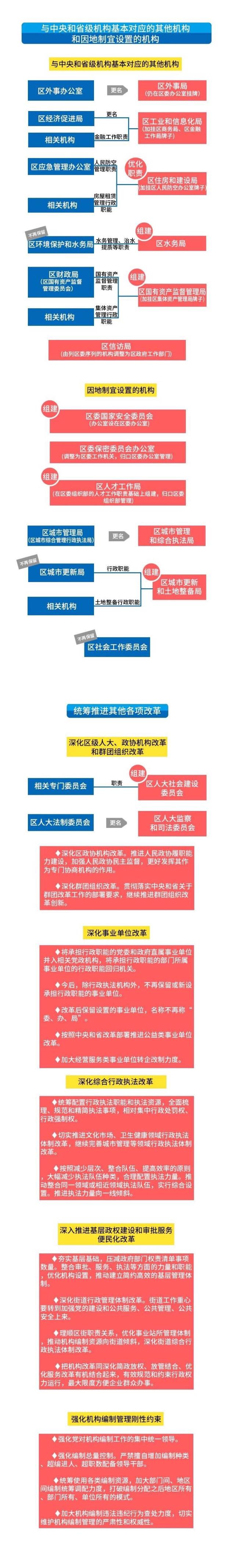 本次區(qū)級機構(gòu)改革,總的要求是中央及省明確的改革任務要堅決落實到位,主要機構(gòu)設置同省、市保持基本對應。同時,又充分體現(xiàn)地方機構(gòu)綜合設置的特色,以推進黨政機構(gòu)職能優(yōu)化協(xié)同高效為著力點,改革機構(gòu)設置,優(yōu)化職能配置,深化轉(zhuǎn)職能、轉(zhuǎn)方式、轉(zhuǎn)作風,提高效率效能,積極構(gòu)建系統(tǒng)完備、科學規(guī)范、運行高效的機構(gòu)職能體系,構(gòu)建簡約高效的基層管理體制。
