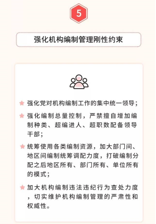 五是全面落實(shí)優(yōu)化協(xié)同高效原則。堅(jiān)持一件事情原則上由一個(gè)部門(mén)負(fù)責(zé),把理順職責(zé)放在重要位置,從有利于突出主業(yè)、有利于服務(wù)管理的角度出發(fā),實(shí)事求是,科學(xué)設(shè)置黨委和政府機(jī)構(gòu),宜大則大、宜小則小,該加強(qiáng)的加強(qiáng)、該精簡(jiǎn)的精簡(jiǎn)、該優(yōu)化的優(yōu)化,實(shí)現(xiàn)機(jī)構(gòu)職責(zé)的深度融合。