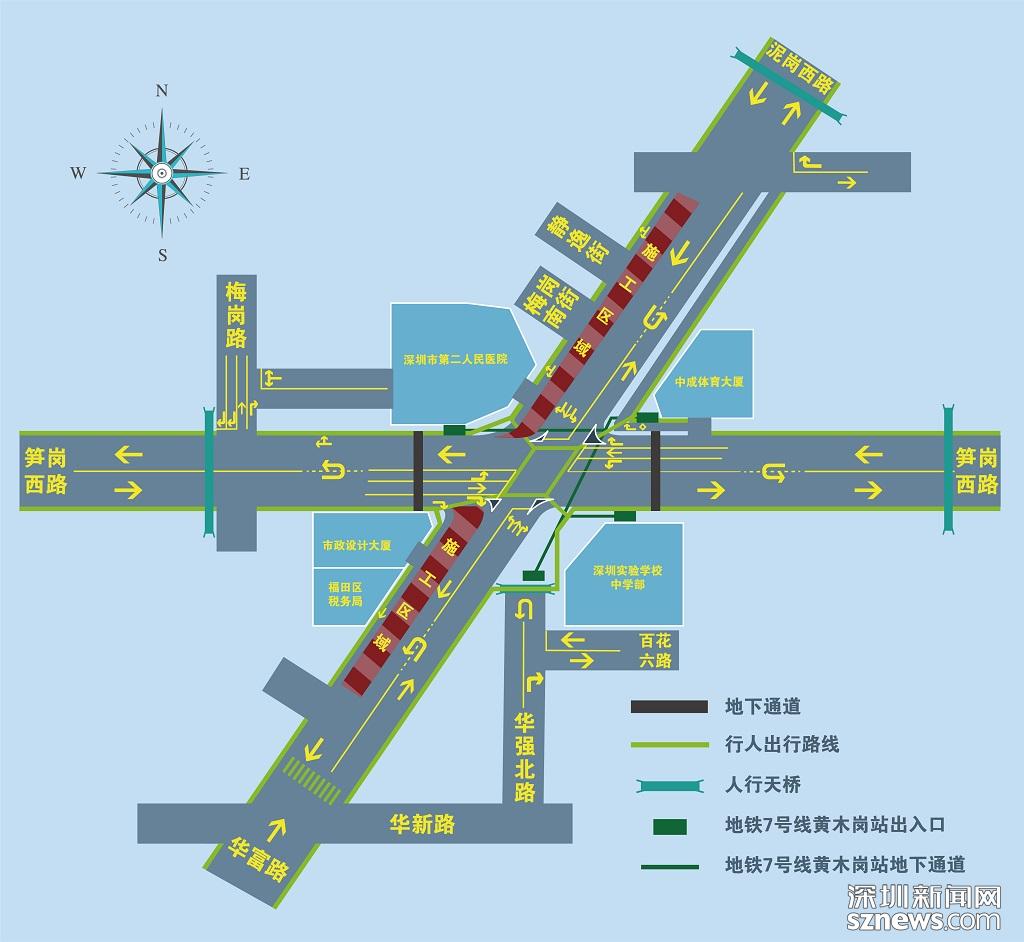 需要注意的是,恢復(fù)路面交通后,行人過街通道也同步調(diào)整。市民可直接從華富-筍崗平交路口穿行過街,也可由筍崗西路的兩條地下通道通過。同時,地鐵7號線黃木崗站在運(yùn)營時段(06:22-23:54)也可為市民過街提供方便。此外,泥崗西路北端、華強(qiáng)北路北端及筍崗西路東西兩端均設(shè)有人行天橋可供通行。