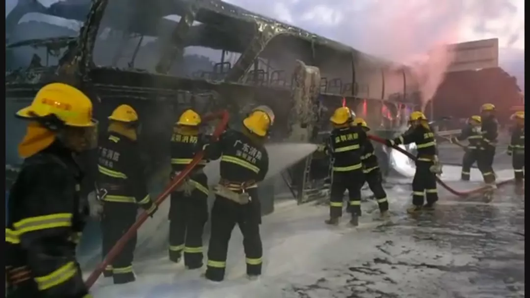 通過泡沫滅火劑覆蓋的方式,火勢最終得到控制,但整個大巴也被燒的只剩下框架。車上的兩名司機介紹,他們從桂林發(fā)車來到深圳,因為剛剛在附近車站下客,車上并無乘客。而起火原因兩人也并不清楚。