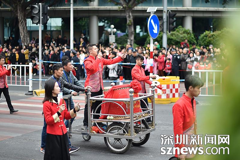 傳統(tǒng)的潮州大鑼鼓也在巡游隊伍中敲響