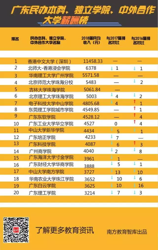 ▲廣東民辦本科、獨(dú)立學(xué)院、中外合作大學(xué)薪酬20強(qiáng),港中文(深圳)成全省首個(gè)平均月薪過萬高校。