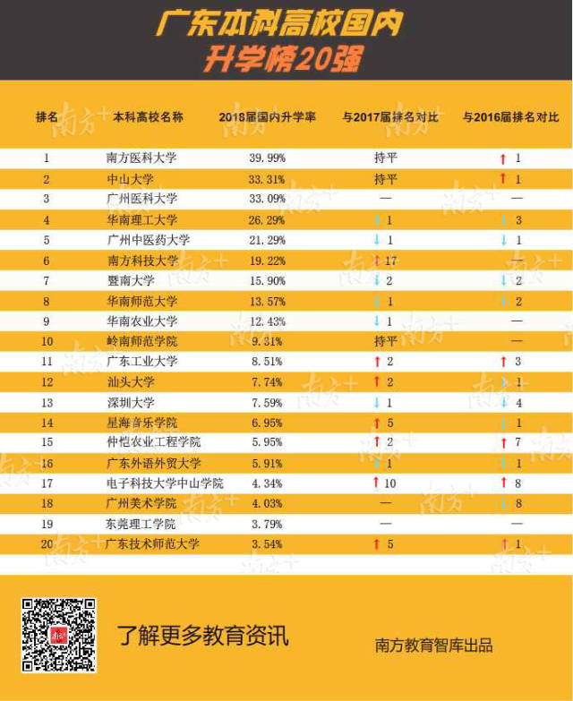 在發(fā)布“薪酬榜”后(點(diǎn)擊查看“薪酬榜”),今天南方教育智庫(kù)繼續(xù)獨(dú)家推出廣東高?!吧龑W(xué)榜”,梳理全省123所高校發(fā)布的《2018年畢業(yè)生就業(yè)質(zhì)量年度報(bào)告》的關(guān)鍵數(shù)據(jù),聚焦畢業(yè)生的深造路徑和升學(xué)比例。其中南方醫(yī)科大學(xué)、中山大學(xué)、廣州醫(yī)科大學(xué)本科畢業(yè)生國(guó)內(nèi)升學(xué)率位列前3名,均超過(guò)33%。