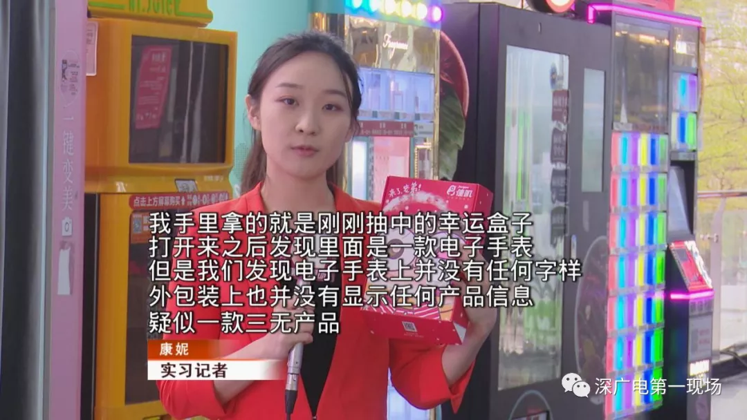 記者注意到,這家商場里擺放的除了口紅機外,還有所謂的“幸運禮盒”機,這個機器外型與自動售貨機相似,游戲規(guī)則更加簡單粗暴,只要掃碼付款三十元,就能得到一個幸運禮盒。但禮盒里的獎品卻讓記者大跌眼鏡。
