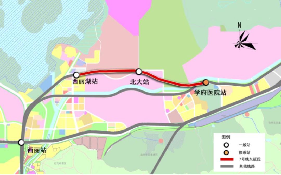 7號(hào)線東延起于既有7號(hào)線西麗湖站后,往東穿越深圳野生動(dòng)物園,進(jìn)入麗水路后于北大西門麗水路于西麗春園路交叉口處設(shè)置北大站,后穿過西麗高爾夫鄉(xiāng)村俱樂部與大沙河,于學(xué)苑大道與幽蘭路的交叉口設(shè)終點(diǎn)站學(xué)府醫(yī)院站。