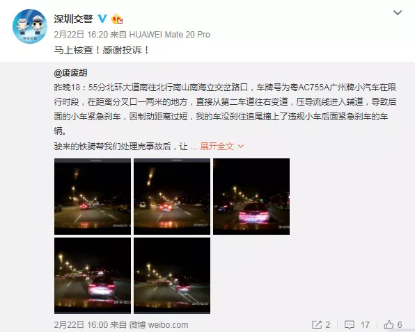 深圳新聞網(wǎng)2019年2月26日訊(記者 劉婷)據(jù)深圳交警權威發(fā)布消息,2019年2月22日下午16時22分,深圳交警收到微博網(wǎng)友舉報稱:2月21日18時55分,在北環(huán)大道南海立交路段,一輛廣州牌照小車在深圳限行時段,連續(xù)變道并壓導流線進入輔道,導致后面兩車發(fā)生追尾事故。深圳交警立即對舉報信息進行分析、經過后臺系統(tǒng)查詢,與被舉報廣州車牌小車車主取得聯(lián)系,但車主稱不是其本人開車,而且人和車都在廣州,不方便來深圳處理。