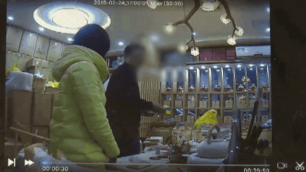 店里的監(jiān)控視頻顯示,這位顧客試了試茶,從錢包里掏出了100元,遞給了店員小娟。秦女士則去了另一端的冰柜里拿鐵觀音。小娟驗(yàn)過錢之后,便把100元錢放在了桌面上。