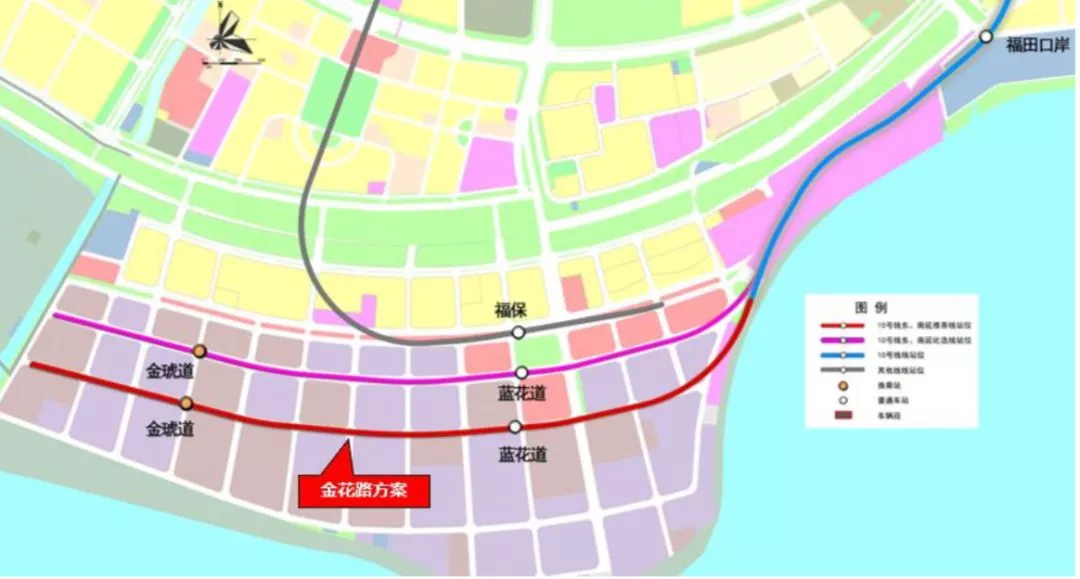 10號線南延線路起自在建10號線福田口岸站,向西南敷設(shè),以金花路和金葵路交叉口為終點(diǎn)。線路全長約3.0公里,采用地下敷設(shè)。