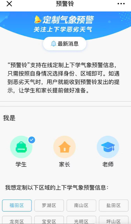 開學首日,深圳市氣象局就聯(lián)合深圳市教育局推出上下學時段高級別臺風暴雨預(yù)警提示服務(wù)——“預(yù)警鈴”,廣大學生和家長可以通過關(guān)注“深圳天氣”微信公眾號進入“市民互動→預(yù)警鈴”頁面定制上下學預(yù)警信息,及時掌握自己所在區(qū)域的天氣狀況,合理安排出行,保障學生安全。