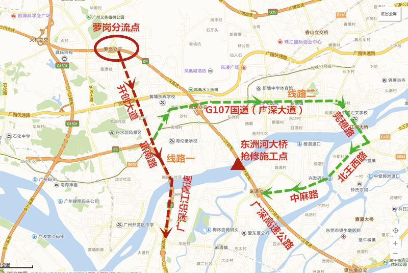 (2)廣深高速公路深圳方向蘿崗出口→開創(chuàng)大道→ G107國道(廣深大道)→莞穗路→北王西路→中麻路→廣深高速公路麻涌站入口→東莞、深圳。