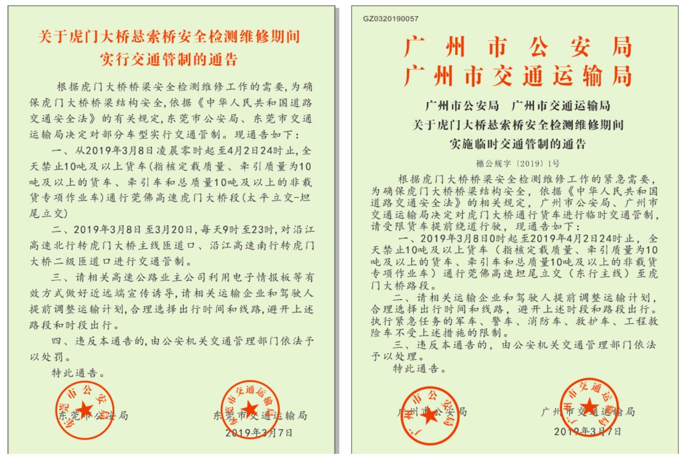 根據(jù)廣州市、東莞市兩地公安局和交通運(yùn)輸局通告,從2019年3月8日0時(shí)起至4月2日24時(shí)止,全天禁止10噸及以上貨車(指核定載質(zhì)量、牽引質(zhì)量為10噸及以上的貨車、牽引車和總質(zhì)量10噸及以上的非載貨專項(xiàng)作業(yè)車)通行莞佛高速虎門大橋段。