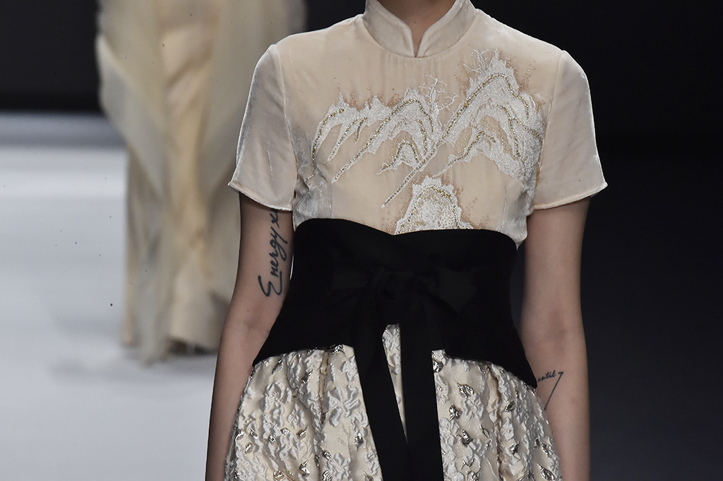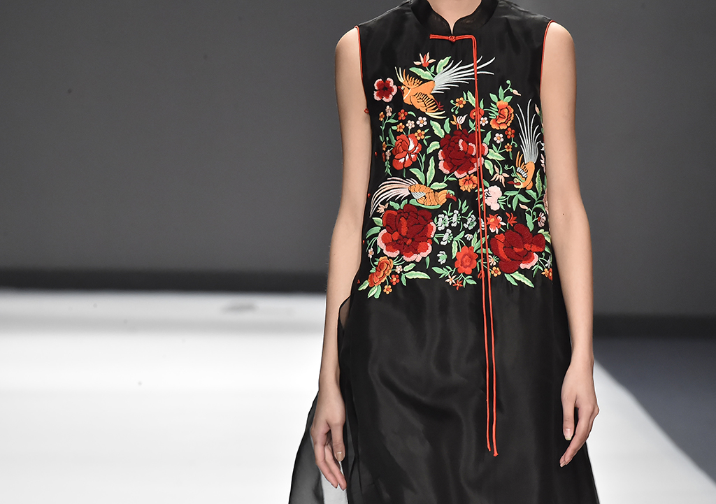 模特正在展示品牌Sunshine見花開的服裝花朵作為設(shè)計(jì)的一部分凸顯東方美感