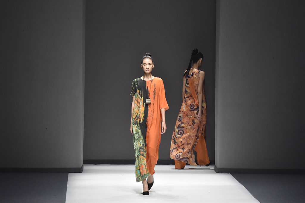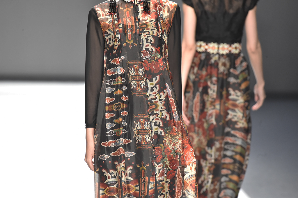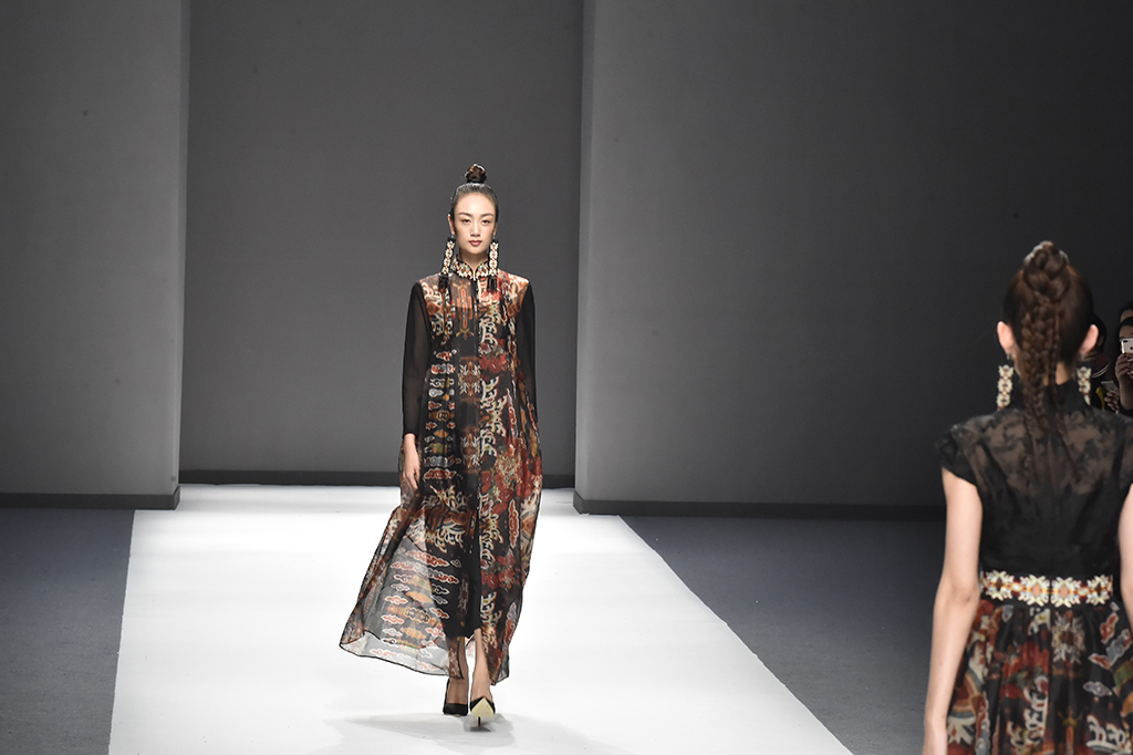 模特正在展示品牌Sunshine見花開的服裝服裝凸顯東方特色